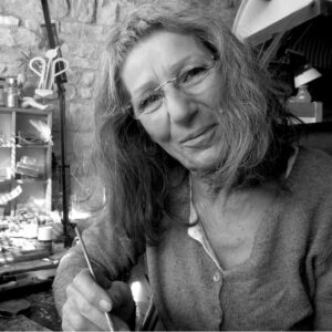 Ma technique consiste en une recherche permanente sur toutes les matières possibles que je peux allier grâce à une résine de synthèse. La résine est une matière très légère et très souple, qui me donne une grande liberté dans l’élaboration de mes modèles. Ceux-ci sont, dans un premier temps, « esquissés » avec un fil d'acier galvanisé. Des tissus (cotons, soies, polyester...) ou différents papiers (journal, magazine, papier glacé ou papier photo peint....) ainsi que des peintures à même la résine vont représenter la première strate de mon bijou. Sur cette base je vais créer des motifs à partir de verres, miroirs, métaux, matières naturelles (galets, coquillages et graines) matières textiles (galons, broderies)…